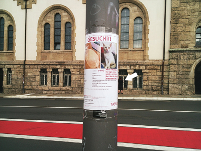 | En lantaarnpalen zijn het domein voor kwijtgelopen katten. Kijk even in je kelder of Shiro er misschien opgesloten te verdorsten zit. De meneer op de achtergrond (zie pijl) levert al vast zijn bijdrage. |