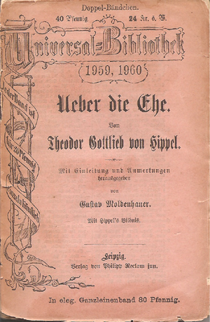 koning Friedrich der Grosse weer in de aloude Pruisische familie-adel herberoepen werd, zal de bruid al vergeven zijn geweest.Persoonlijke ervaring met het huwelijk had hij dus niet, maar het is dan ook geen zelfhulpboek. Wel geldt het als een belangrijk werk aangaande de Europese vrouwen- emancipatie. In het in 1774 verschenen boek hield hij een pleidooi voor een huwelijk gebaseerd op wederzijdse liefde, respect en vriendschap. Philipp Reclam jun , bekend