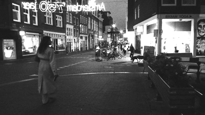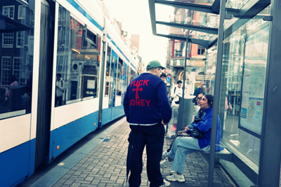 | Hij heeft een mening, tenminste het staat achter op zijn jas: Fuck money. Ik weet niet of de twee meisjes die hij aanspreekt er net zo over denken. |