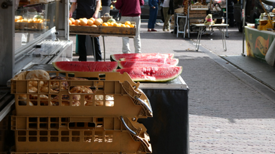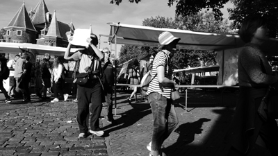 | Markt bij de Waag. Die meneer staat vast op een internationale opsporingslijst of hij wil heel aanstellerig niet op de foto. |