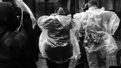 dreiging van regen doe je een degelijke regenjas aan, je verkleedt je