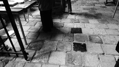 alom aanwezige oude keitjes, tegels en kinderkopjesachtige ondergronden