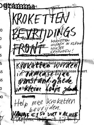 'Kroketten worden onder onmenselijke omstandigheden opgesloten gehouden in kleine hokjes. Help ze al voor 1,50 bevrijden. Steun het Kroketten Bevrijdingsfront.' |